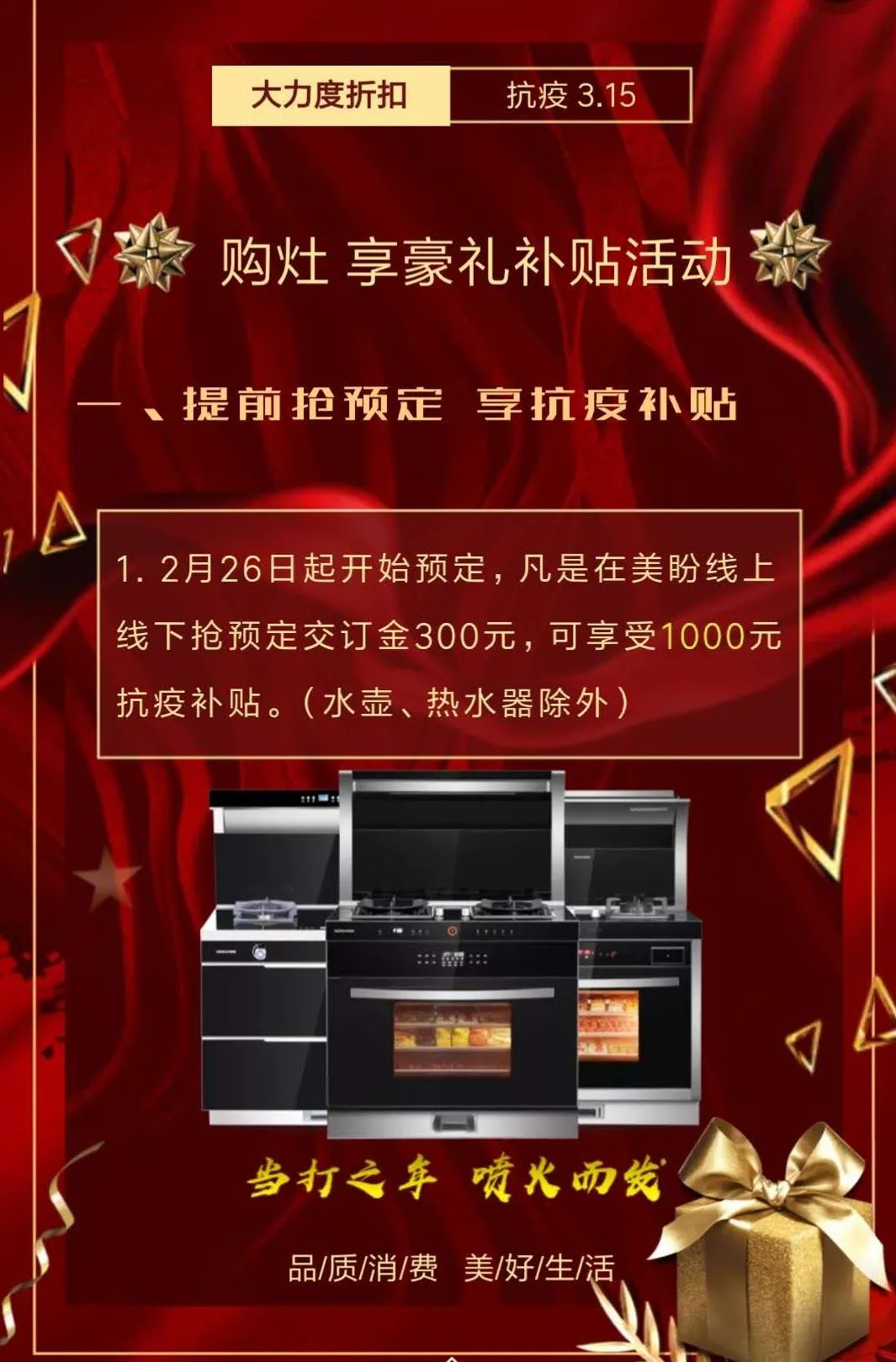 2020美盼线上线下“抗疫●3.15” 万件厨电补贴活动,正在火热进行中,打响了抗疫健康保卫战。介于疫情防控还没有结束,很多人还是会选择宅在家中,为了不影响消费者的日常需求,美盼特推出了线上线下“抗疫●3.15”钜惠活动,即使足不出户,也可以享受低价实惠的美盼产品。